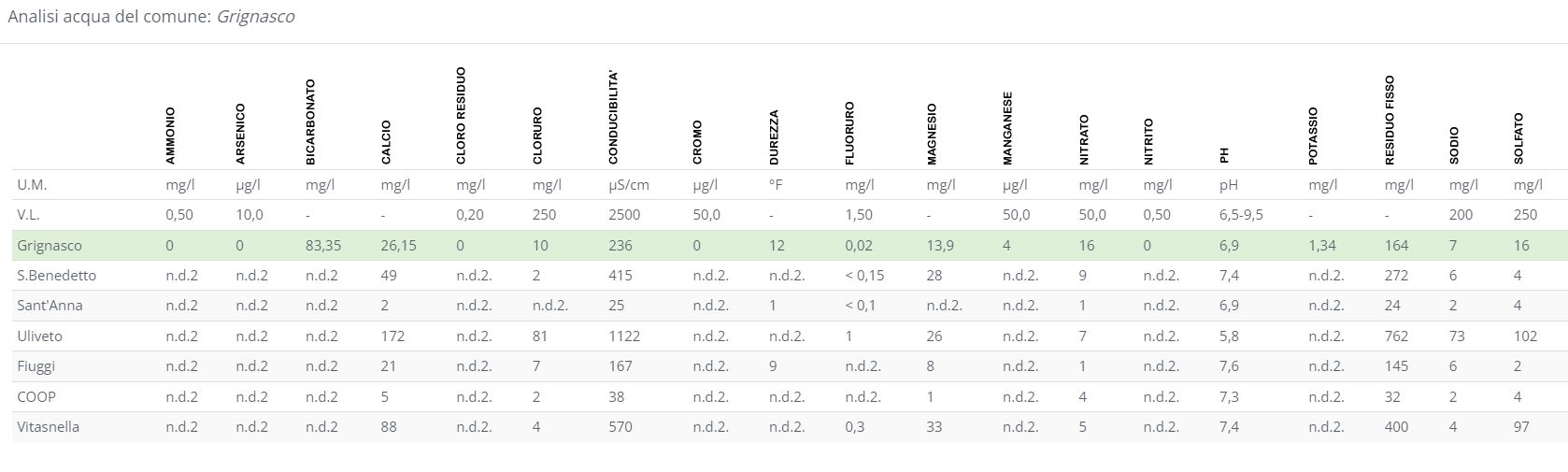 La composizione dell'acqua prodotta dall'acquedotto è consultabile sulla pagina https://www.acquanovaravco.eu/AnalisiAcqua?id=qualita-dell-acqua. Selezionare il comune di Grignasco e l'ultimo periodo disponibile
